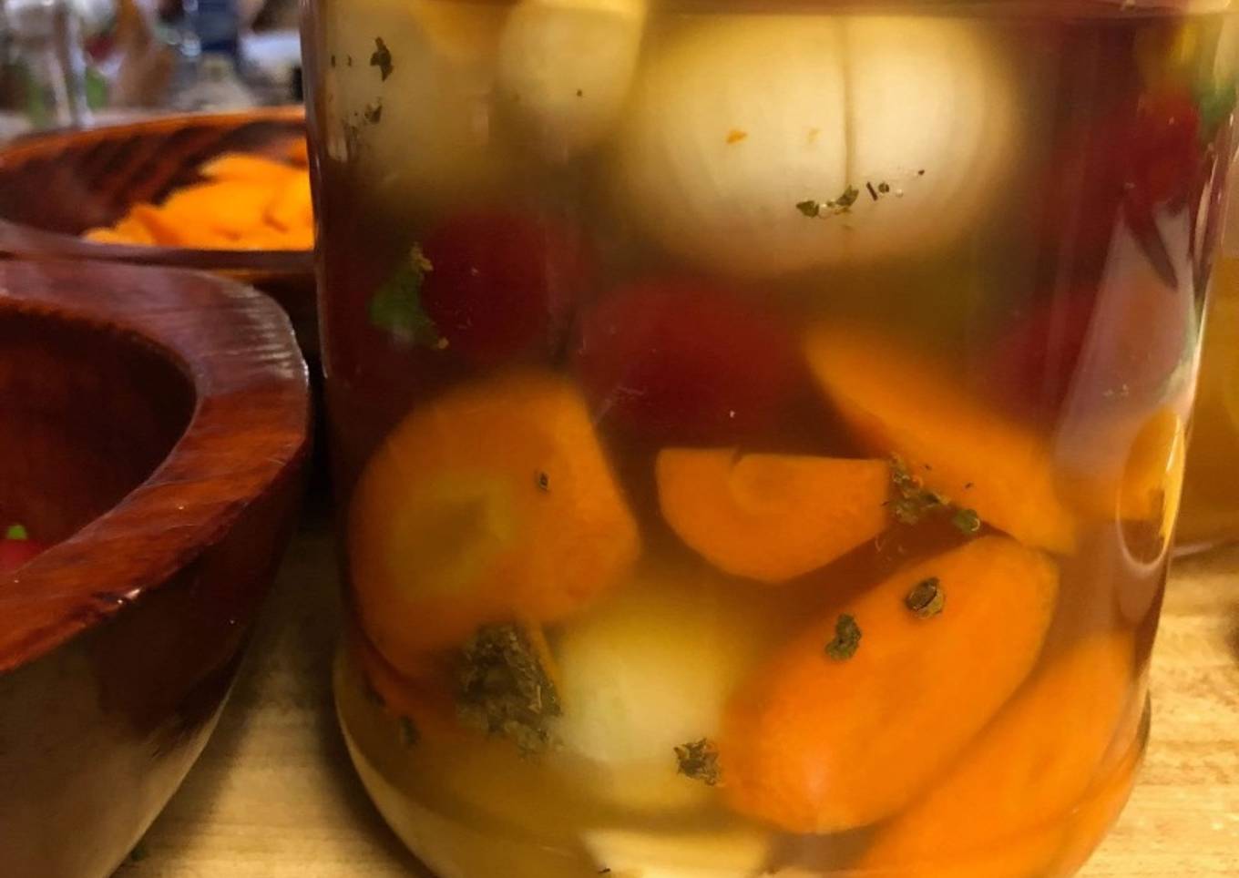- Primero llenas tu frasco para curtir con chilitos, cebollines, y zanahorias, así...alternadamente. También si es preciso a la mitad puedes agregar unos cuantos ajos. Te saldrán de dos a tres frascos, con esta cantidad de chiles y vegetales. Dependiendo de el tamaño de tu vitrolero. Después le agregas el orégano y por último el vinagre. En la tapa para que lleves una cuenta más exacta de cuándo tu curtido estará listo le pones la fecha, y a partir de ahí en tres semanas ya lo podrás saborear.