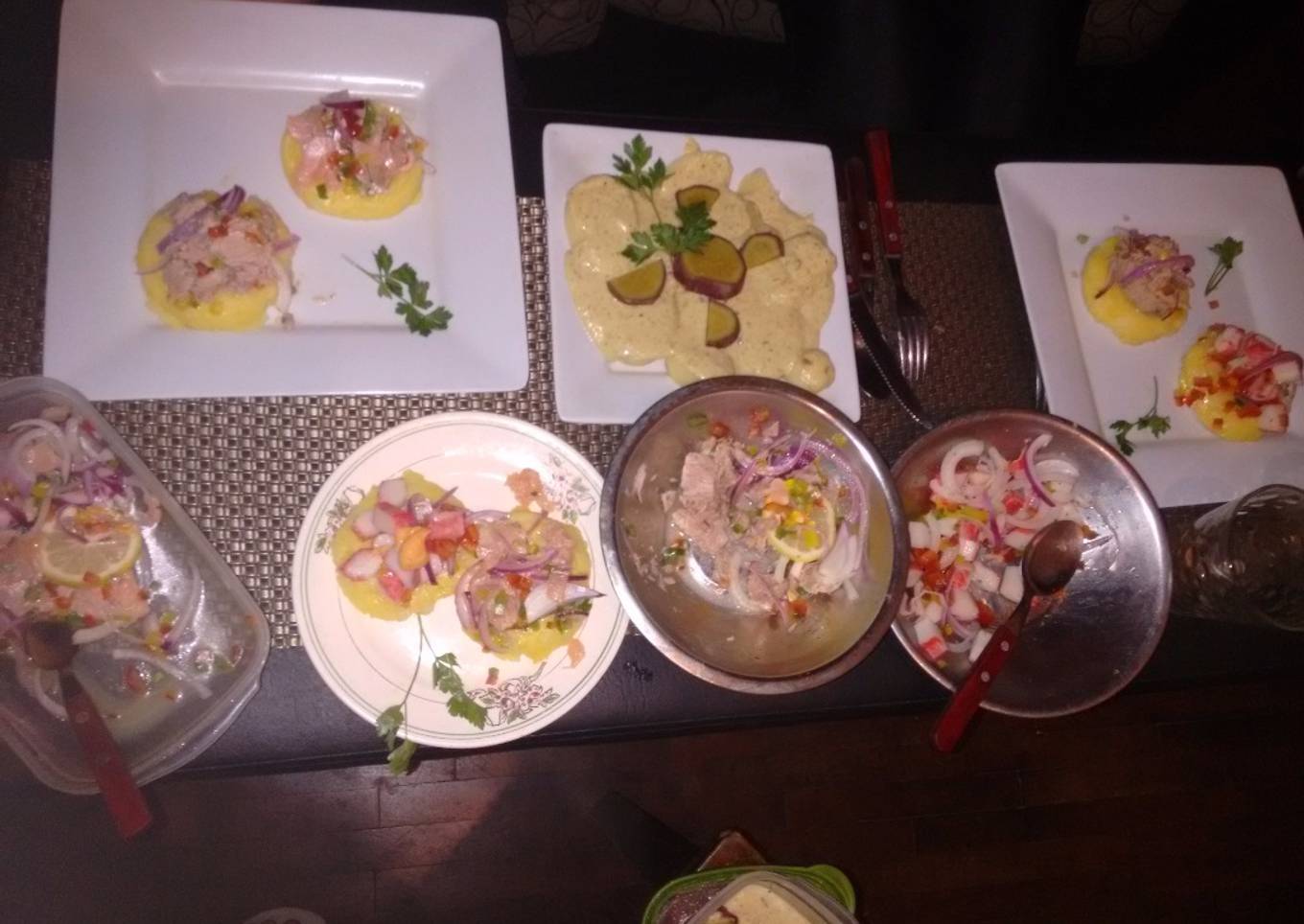 Comida peruana ceviche, causa limeña y papas huancaina