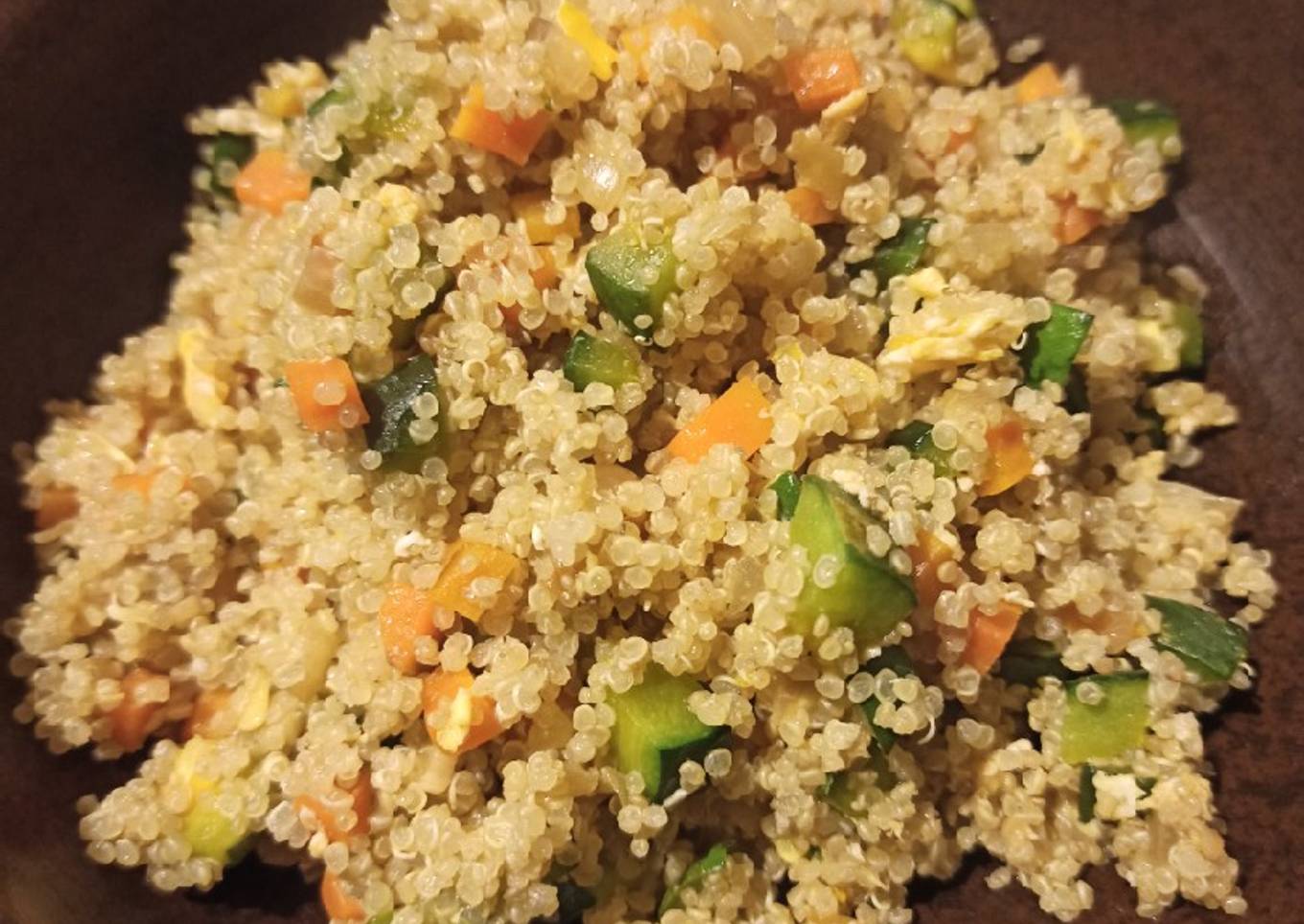 - Mezclar en la misma sartén (ya apagada) con la quinoa cocida. Se puede añadir mas salsa de soja si hace falta. Listo para servir.