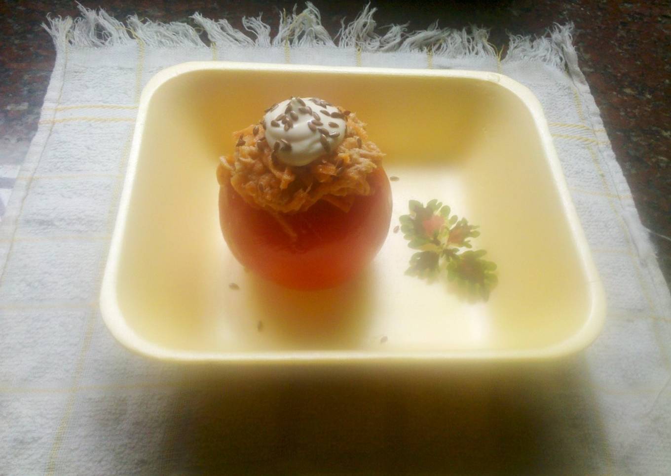 Mis queridos, tengo el agrado de presentarles mi tomate relleno especial dieta, light y sin arroz xD Porque mi nutricionista no me deja comer arroz, así que lo reemplacé por zanahoria. Desde que empecé a hacer dieta para bajar de peso, he probado varias combinaciones de carnes y ensaladas, y me he dado cuenta de que el atún va muy bien con la zanahoria, así que se me ocurrió hacer un tomate relleno con zanahoria y atún. He aquí la receta...
