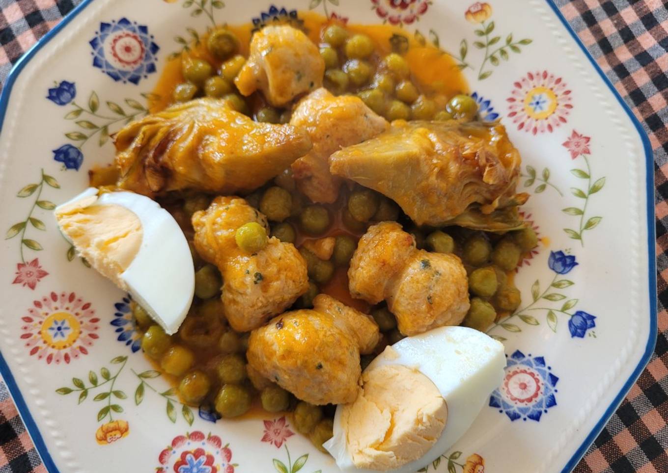 Un guiso muy económico y riquísimo, me sobró un poco de salsa de albóndigas y preparé con una butifarra de pollo, una alcachofa y un huevo duro, una sabrosa comida.