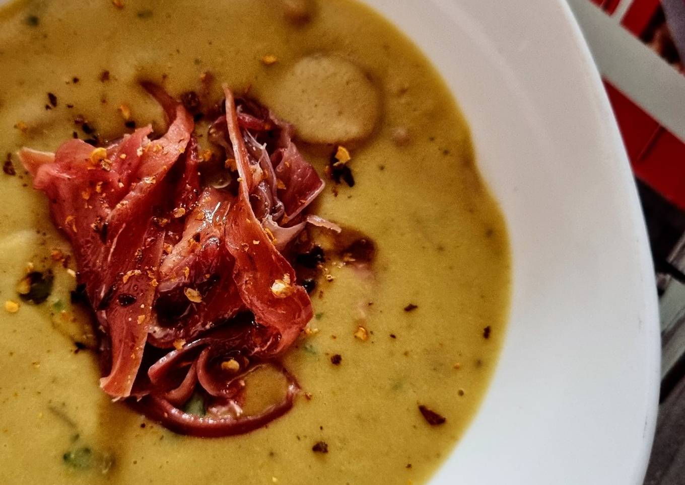 - Bien caliente la crema de frijol, adicion茅 el sofrito de chorizo y jam贸n. Hmmmm...!!! Y un铆, rectifiqu茅 sabor, de locos..!!馃槼馃槼馃槼Pas茅 a plato de servicio y adorn茅 con jam贸n serrano, coronado con miel de abejas y peperonccino. Hay que probarlos, los invito y que se venga la lluvia de corazones, los espero馃挌馃挋馃挍馃挏馃А馃...!!