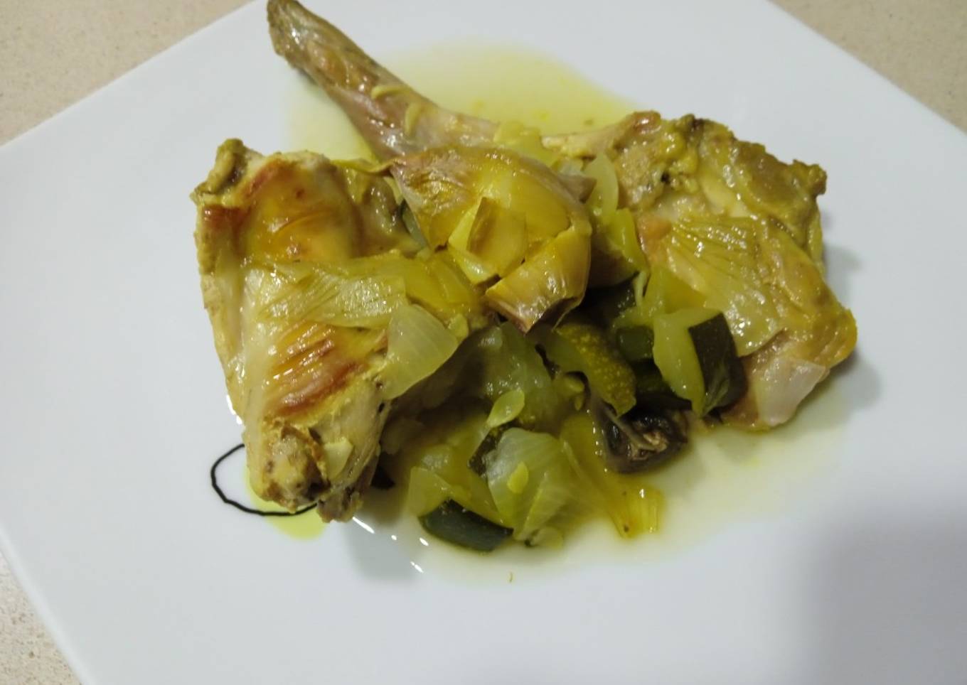 Conejo con verduras pochadas