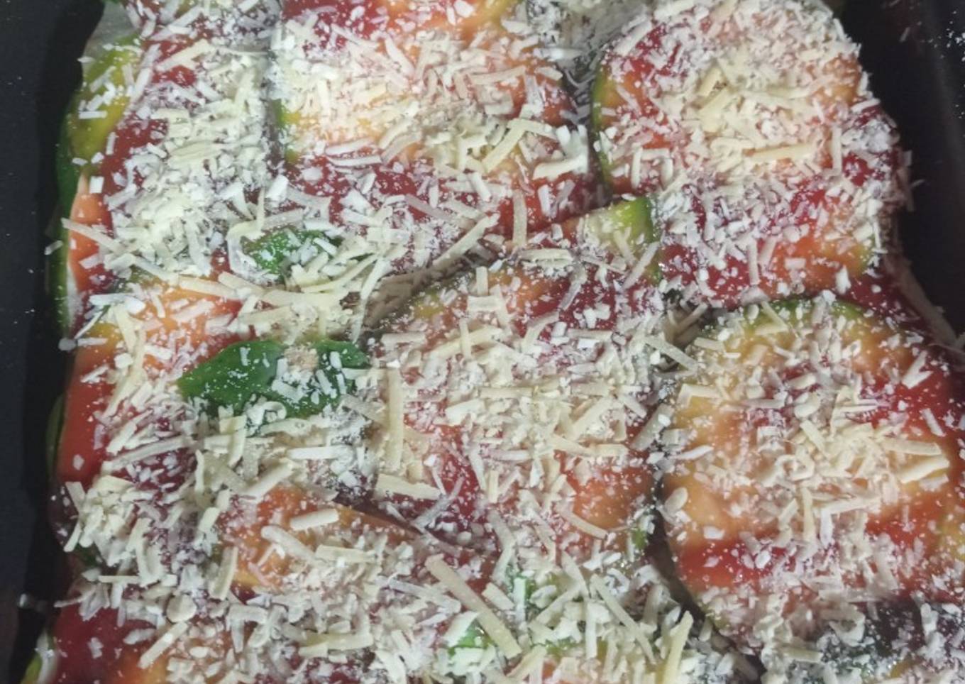 - Colocar una última capa de zapallitos, poner salsa de tomates sobre la misma y queso rallado.