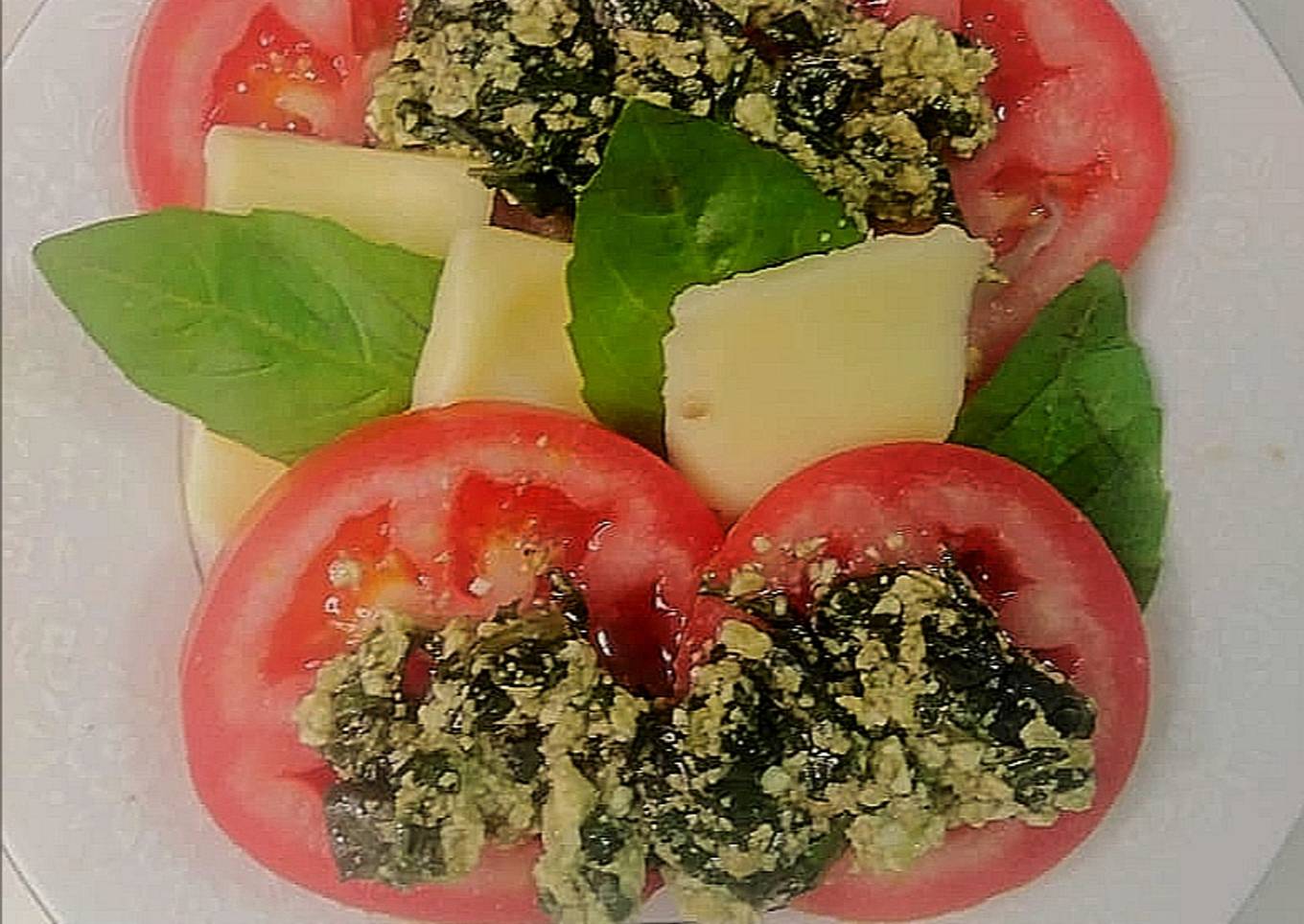 - En un plato, colocar adornando e intercalando las rodajas de tomate con las láminas de queso mozzarella y las hojas secas de Albahaca. Terminamos colocando un poco de pesto sobre las rodajas de tomate.