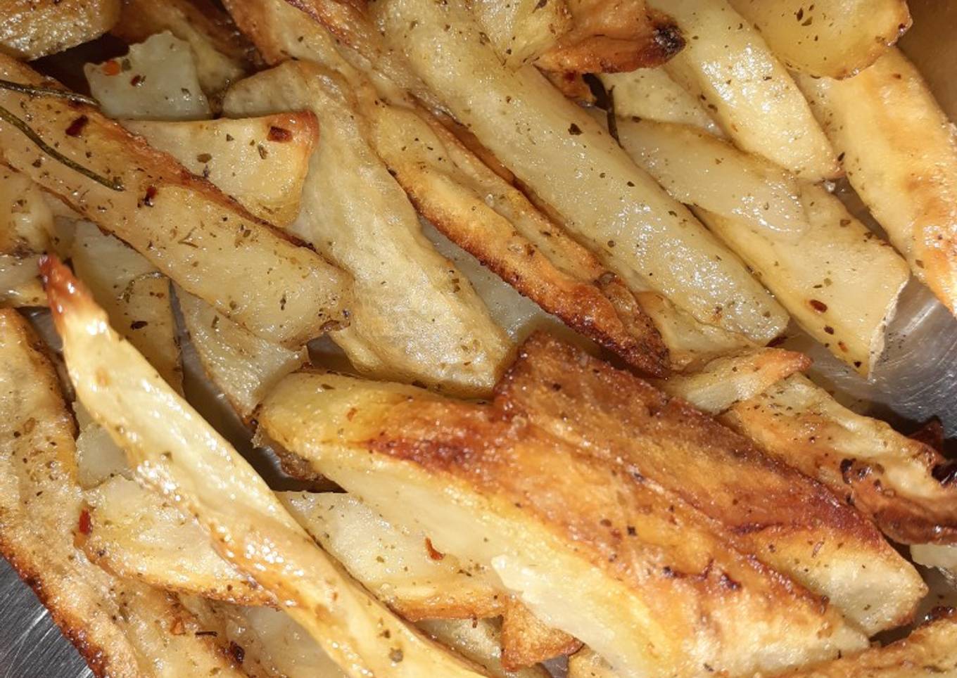 - Cortan a la mitad la papa y cortan en bastones. Las condimentas con romero, orégano y sal.
